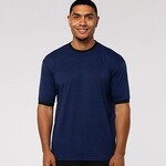 A4 ADT SOFTEK RINGR T. 65% Recycled Poly, 35% Natural Cotton. 4.1 ounces. Moisture wicking to keep athletes cool. Stain and odor release for easy care. Earth friendly. Contrast ribbed collar and cuffs. Easy tear away label for rebranding.